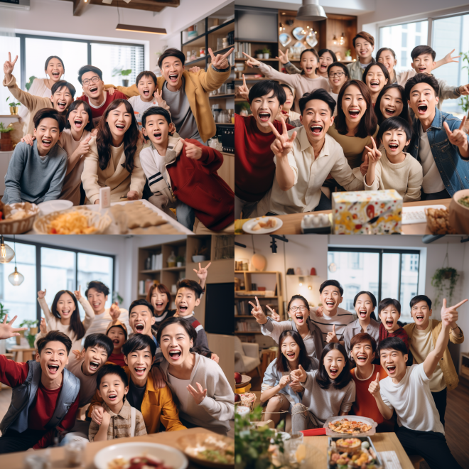 Please generate a high-resolution camera-shot photo of a family living room scene, where a Chinese high school student is joyfully holding his report card and is surrounded by proud relatives and friends congratulating him. Use a low angle shot and the rule of thirds, with an aperture of f/2.8 to f/4 and a shutter speed of 1/250 second or faster. The picture should contain items such as a sofa, dining table, and other household elements, with the subjects wearing expressions of happiness. The lighting should be soft. The picture should be vertically composed with an aspect ratio of approximately 9:16, suitable for the cover photo