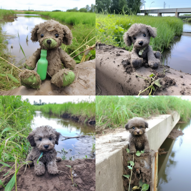 A gray Teddy puppy went to the countryside with her owner for vacation. Her owner stood by the cement railing next to an irrigation canal. In order to get close to her owner, the little Teddy puppy took a leap forward but accidentally fell into the filthy ditch. The water inside was green and dirty. The Teddy puppy was still in shock, paddling desperately in the green sewage with her limbs. She was terrified, as if the whole world was spinning around. The Teddy puppy looked at her owner in panic, hoping her owner could save her from this horrible trap. Seeing this, the owner hurried over and fished the Teddy puppy out of the ditch. The Teddy puppy fell into his arms, trembling all over with chattering teeth. Her pink little nose was covered in disgusting filth. The owner gently stroked the Teddy puppy and comforted her, "It's okay now, Teddy puppy, you're safe now." The Teddy puppy looked up pitifully at her owner, as if saying "Thank you for saving my life, my owner."