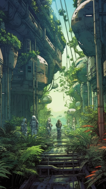 lush vegetation inside a huge sci-fi space station, trees with roots braid the walls, vegetation, gigantism, sci-fi multistory space, in the background of endless space, location, dusk, dystopian environment, game art, Tsutomu Nihei style, Blame!, Sidonia no Kishi, anime, manga graphics, drawing, lots of small details, hyperdetail, highest quality, highest detail, flashing lighting, ambient lighting, third person view, 8K, Ultra-HD, Optical Fiber, --no Person --q 2 --ar 9:16