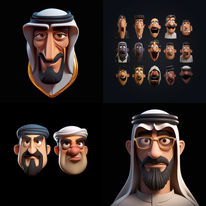 /imagine prompt: Cartoon style Arab billionaires face screens similar to 3D models with black backgrounds:: --ar 1:1 --v 5.1