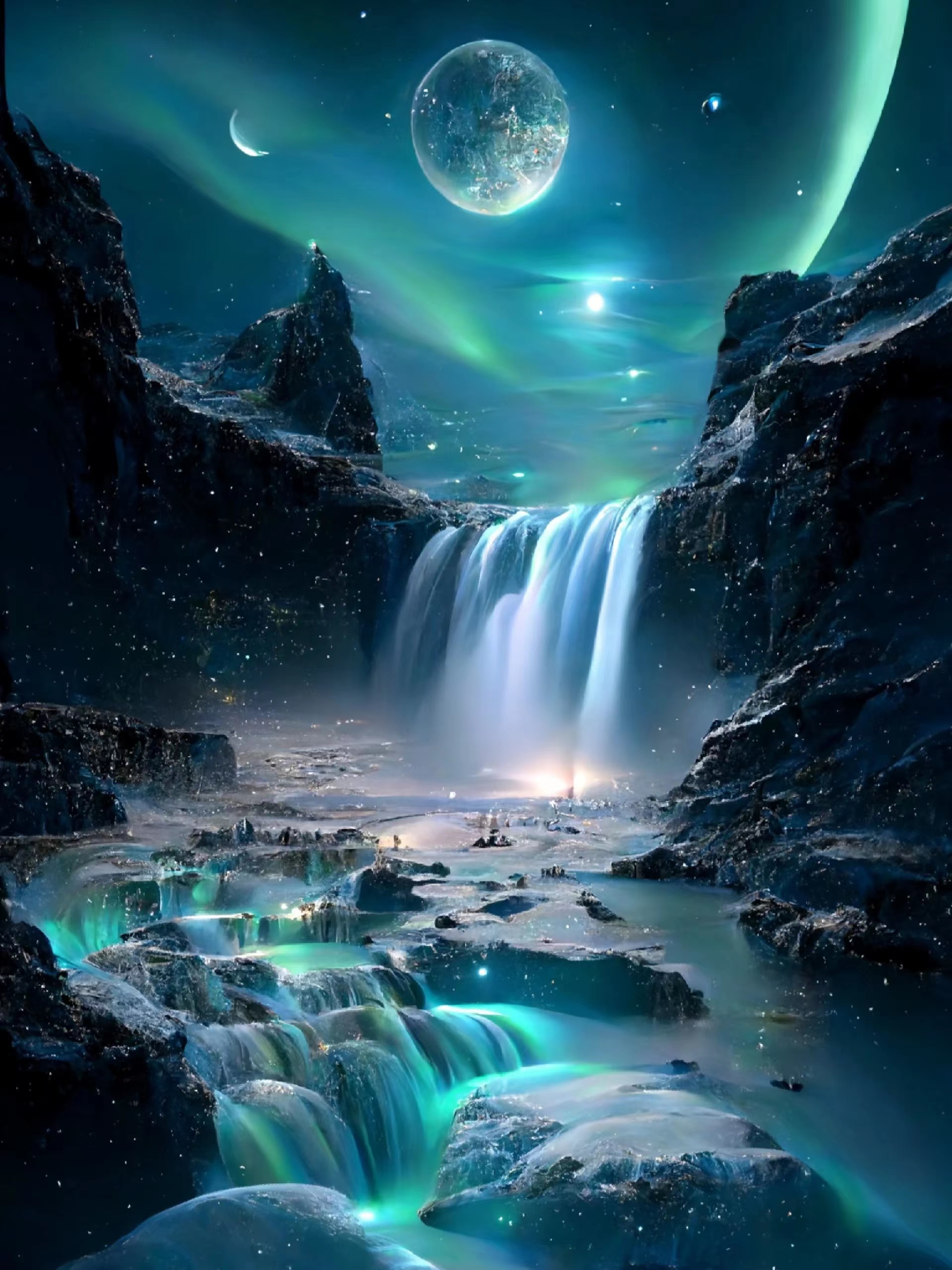 http://www.effecthub.com/disk/3707091/Texture/微信图片_20230514112847.jpg a dark space with an aurora and a waterfall, in the style of vibrant fantasy landscapes, light cyan, 32k uhd, [ephraim moses lilien](https://goo.gl/search?artist%20ephraim%20moses%20lilien), fantasy worlds, serene faces, [thomas kinkade](https://goo.gl/search?artist%20thomas%20kinkade) --ar 3:4