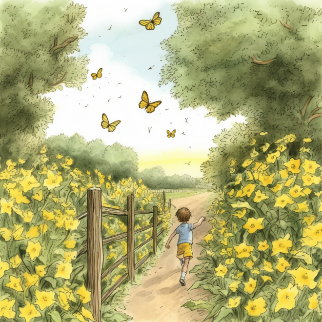 篱落疏疏一径深,树头花落未成阴。儿童急走追黄蝶,飞入菜花无处寻。稀稀落的篱笆旁,一条小路通向远方,路旁树上的花瓣纷纷飘落,新叶刚刚长出还尚未形成树荫。小孩子飞快地奔跑着追赶黄色的蝴蝶,可是蝴蝶飞入菜花丛中就再也找不到了。