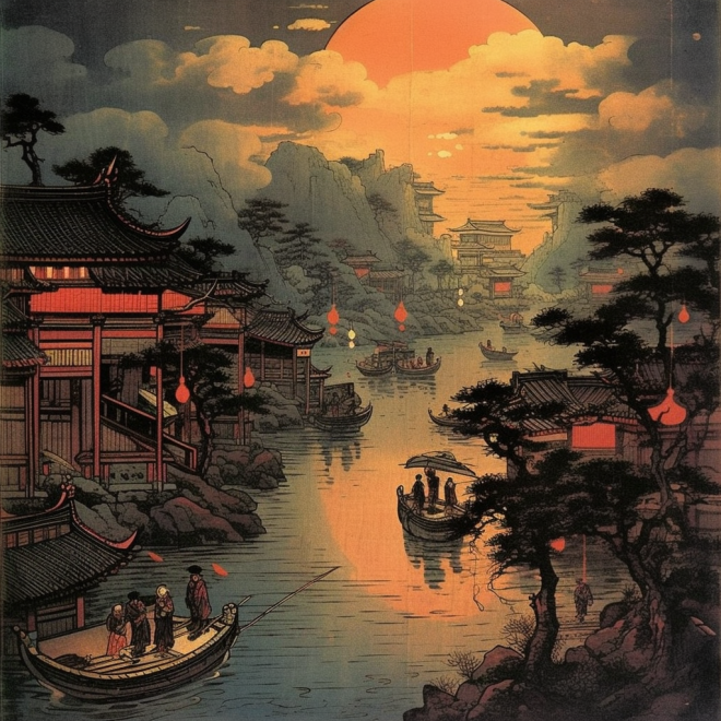 /imagine prompt: Happy Rain on a Spring Night [Author] Du Fu, Good Rain Knows the Season, When Spring Happens. With wind the spring rain sneaks in night. Silently, it moistens everything. The clouds on the wild path are all black, and the fire on the riverboat is bright. When it is dawn, the damp soil will be covered with red petals, and there will be countless colorful flowers in the streets and alleys. Good rain seems to pick the season and come in the spring when all things sprout. Accompanied by the gentle breeze, quietly entered the night. Fine and dense, nourishing all things on the earth. Thick black clouds enveloped the fields and paths, with only a small fishing fire on the riverside fishing boat emitting a ray of light, appearing particularly bright. When the day breaks, the damp soil must be covered with red petals, and the streets and alleys of Jinguan City must also be a colorful scene.:: --ar 1:1 --v 5.1