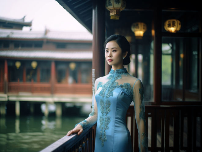 Create: An elegant Chinese woman wearing a qipao confidently showcases the charm and allure of femininity, shot in the style of water towns in southern China, highlighting the powerful femininity of the subject. Captured with a Leica M10-P camera and Summilux-M 50mm f/1.4 ASPH lens, using an aperture of f/2.8, ISO 400, and a shutter speed of 1/125 sec. :: --ar 4:3 --v 5.1
