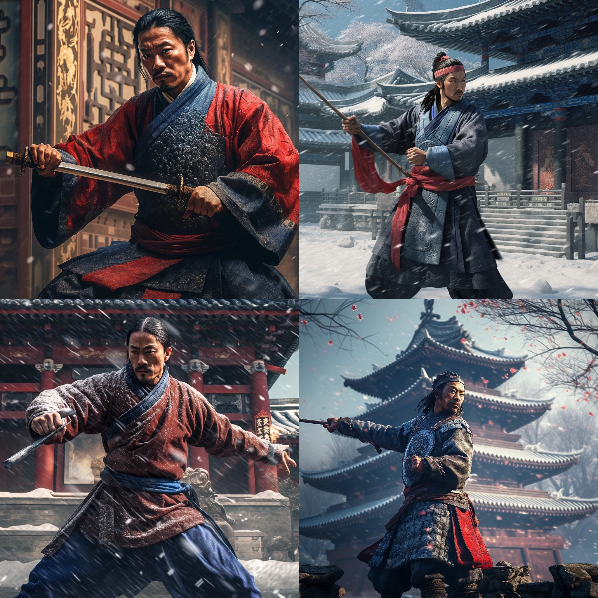 On the basis of this painting, refine the details of the finger area.“Create: Winter morning, middle-aged Asian swordsman, temple background, wearing chivalrous attire, sword-fighting pose, rich colors, abundant details, 35mm lens feel, F1.8 aperture, 8K resolution, cinematic visual effects, realistic lighting and shadows, dramatic tension, lifelike emotions, low-angle perspective.”