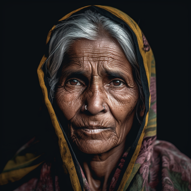 Portrait photography, 30mm lens, F1.8 aperture, a 50-year-old Indian woman; 4K resolution.