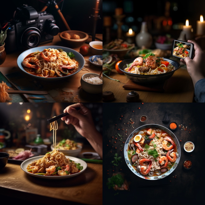 With a 16:9 aspect ratio, capture a vertical view of mixed seafood noodles on a table, showcasing Chinese cuisine; using a 35mm lens with an F1.8 aperture.