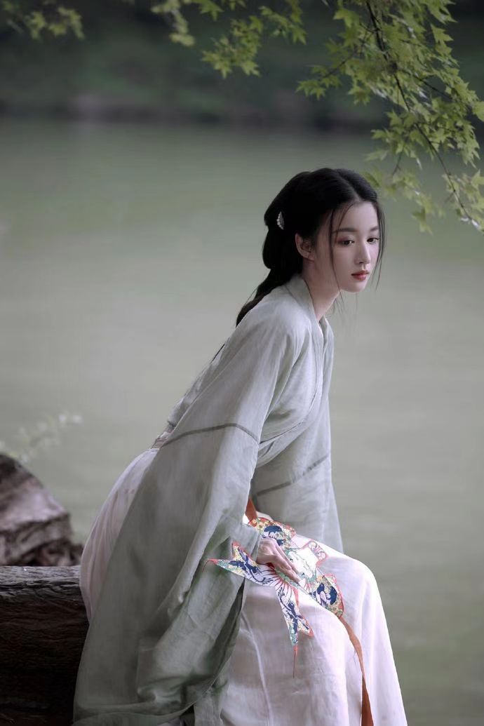 http://www.effecthub.com/disk/3711593/Texture/微信图片_20230611234453.jpg An ancient Chinese beauty, wearing Chinese Hanfu, long hair, sitting under a willow tree, a pair of big eyes, charming, this girl is very beautiful, behind her is the lake, ancient Chinese artist Song Huizong style, Chinese traditional ink painting style, white, writing, willow green and peach red, high detail, high quality