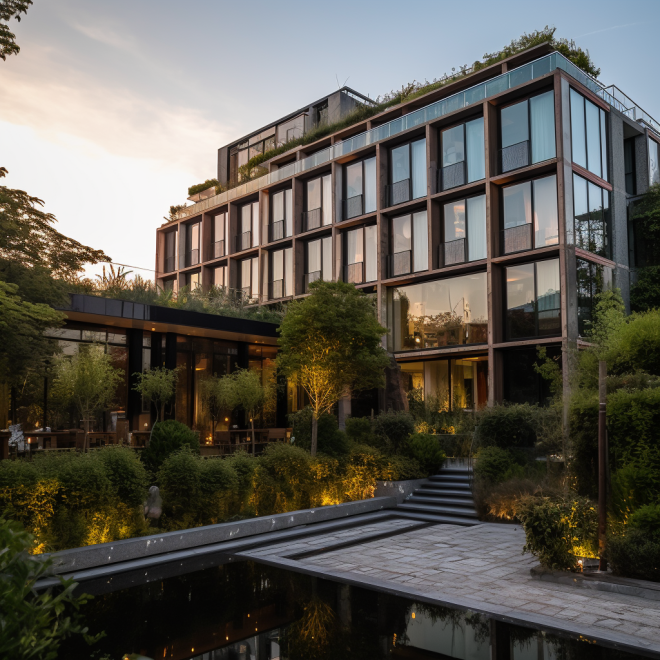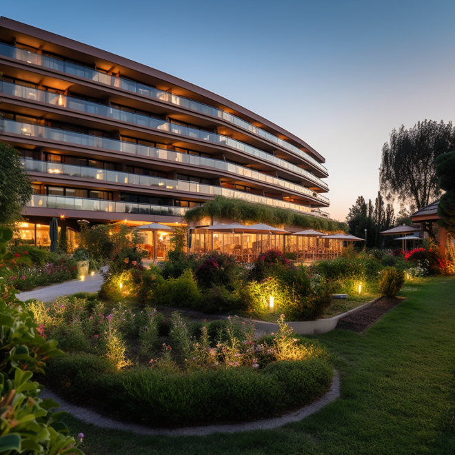 A full-frame front photo of a four-story detached hotel, modern style, with a garden in the front; no pool, taken at sunset. Camera: Sony α7R IV. Wide-angle lens (e.g., 16-35mm) to capture the entire view of the hotel and garden. Settings: Manual mode (M mode); Aperture: Choose a smaller aperture value (such as f/8-f/11) to achieve sufficient depth of field, ensuring both the hotel and garden are clearly visible. Shutter speed: Adjust shutter speed according to lighting conditions to achieve proper exposure. A slower shutter speed (e.g., 1/4 second to several seconds) may be needed. ISO: Use a lower ISO value (e.g., 100 or 200) to reduce noise and ensure image quality. White balance: Use the 'Sunlight' mode under natural light to maintain accurate colors. Use a tripod: In low-light conditions, use a tripod to ensure stability and sharpness. Observe the light: Find an appropriate angle to create interesting and eye-catching patterns of sunlight and shadows