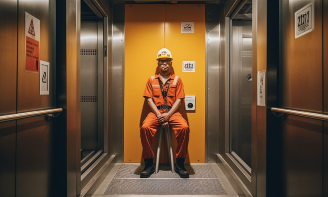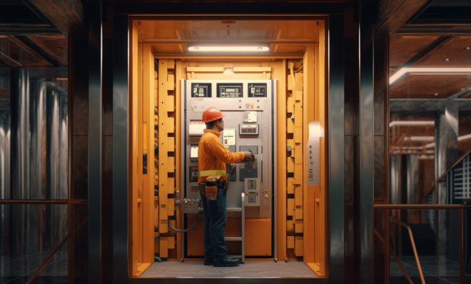 an elevator repairman is working on an elevator in the workplace, in the style of chinapunk, cabincore, modular construction --ar 965:581