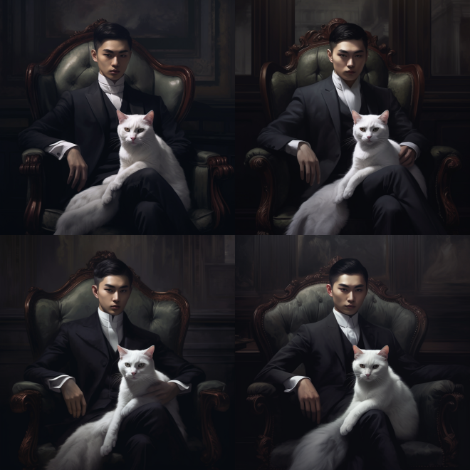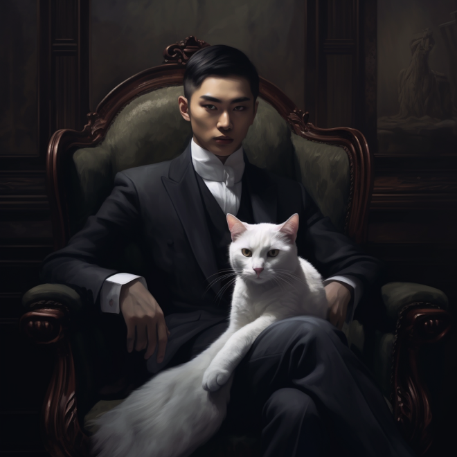 Eighteen year old chinese godfather,a white steppe cat in arms, dark style, court,sitting on a chair, solemn, OC rendering, 16K HD, high-definition style expressiveness