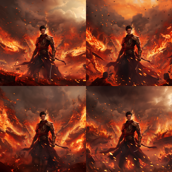 A male hero is placed behind a fiery background, with a deep red and bronze style, Asian faces, large panoramic views, realistic details, piles, kingcore, dansaekhwa ar 16:9