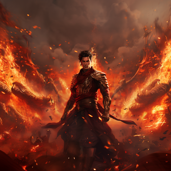 A male hero is placed behind a fiery background, with a deep red and bronze style, Asian faces, large panoramic views, realistic details, piles, kingcore, dansaekhwa ar 16:9