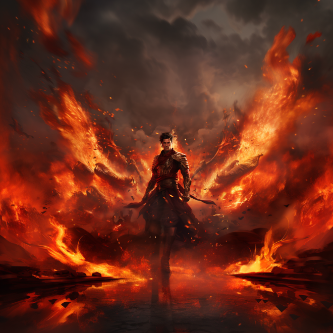 A male hero is placed behind a fiery background, with a deep red and bronze style, Asian faces, large panoramic views, realistic details, piles, kingcore, dansaekhwa ar 16:9