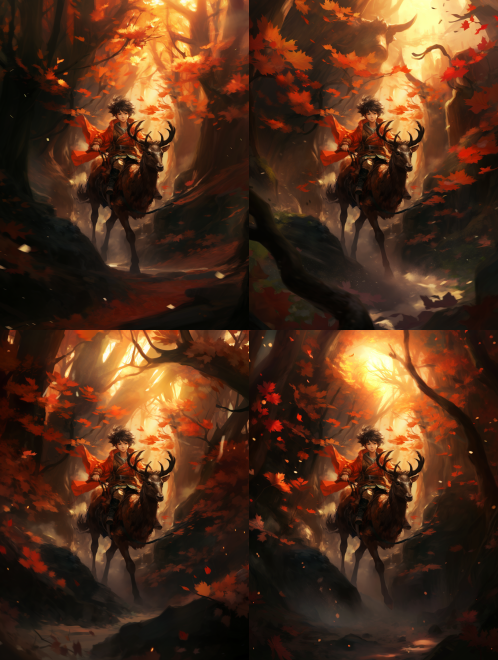 a young boy dressed in red clothing is riding a deer, in the style of changelingcore, cult party kei, light green and dark brown, gongbi, loose brushwork, 32k uhd, dark white and amber --ar 3:4