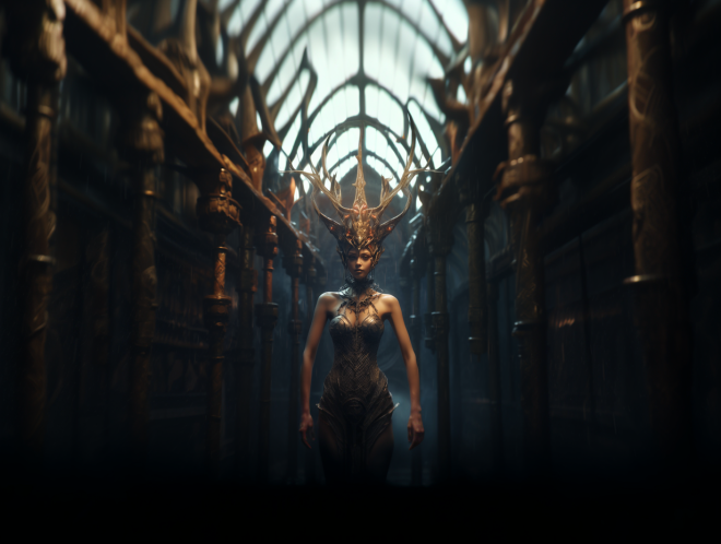 /imagine prompt: Spider queen, the upper body is a beautiful woman, the lower body is a spider, handsome face, rich facial details, horror atmosphere, environment background, full body composition, art style, dim light, film quality, large panorama, 16k:: --ar 4:3 --v 5.1