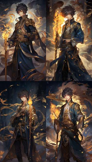 a chinese guy in costume holding a wand with some chinese writing, in the style of light navy and dark gold, [kawacy](https://goo.gl/search?artist%20kawacy), african influence, detailed character design, full body, warmcore, detailed facial features --ar 4:7