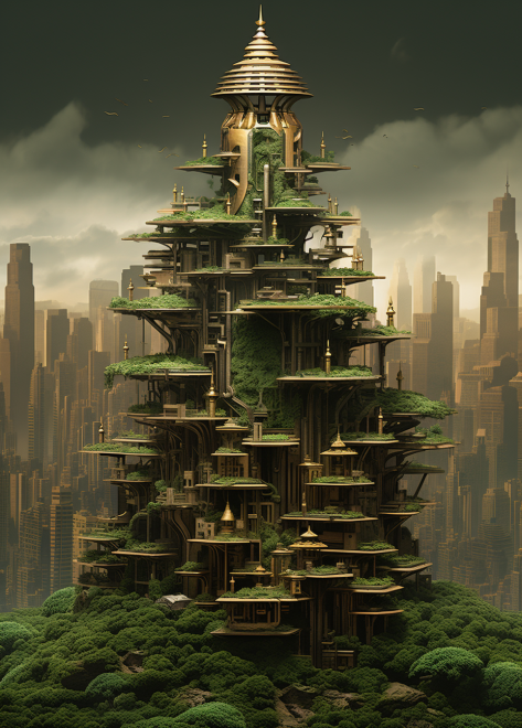 a tower with lots of tall buildings and buildings, in the style of [igor morski](https://goo.gl/search?artist%20igor%20morski), zen buddhism influence, light bronze and emerald, [daniel f. gerhartz](https://goo.gl/search?artist%20daniel%20f.%20gerhartz), experimental narrative structures, majestic ports, [kōshirō onchi](https://goo.gl/search?artist%20k%C5%8Dshir%C5%8D%20onchi) --ar 75:104