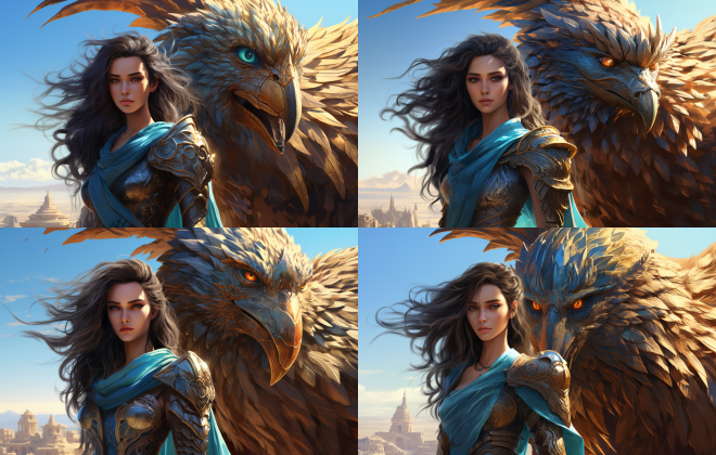 a woman with long hairs and wings stands next to a bird, in the style of dragoncore, epic landscapes, dinocore, hyper-realistic animal illustrations, bold character designs, light brown and dark azure, 20 megapixels --ar 11:7