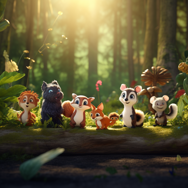 3D animation style, various small animals play together in the forest happily, bathed by the gentle sunlight, and a distant view is shown