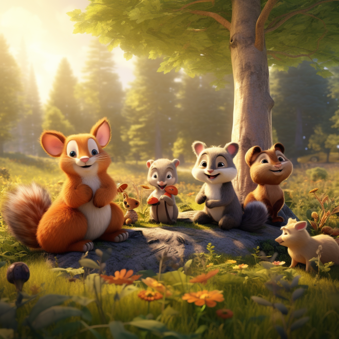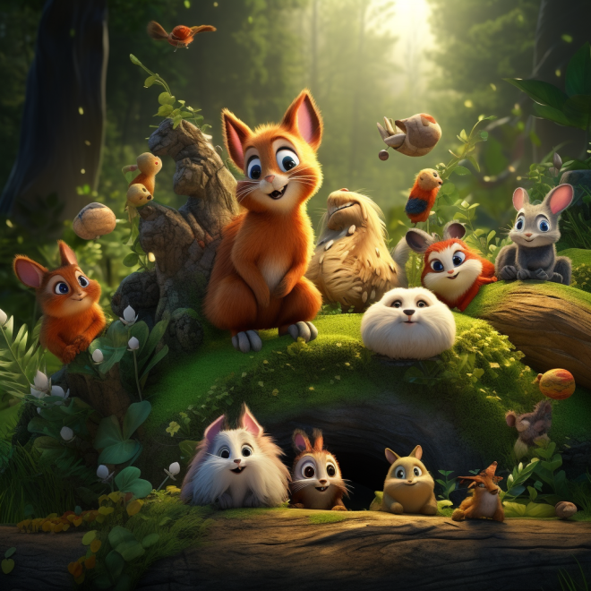 3D animation style, different kinds of small animals play and play games together in the forest happily, bathed by the gentle sunlight, and a wide-angle perspective is shown