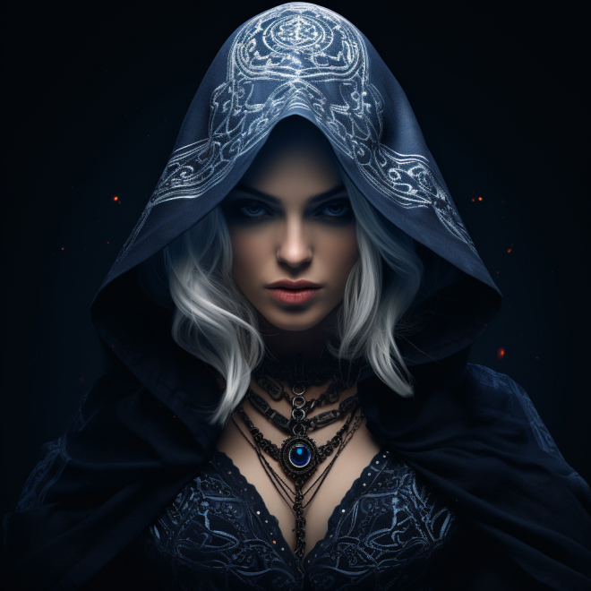 Witch, close-up, porcelain face, tattoo, magic, dreamy, mysterious, sapphire, blender, cloak, black background, masterpiece, digital art, 16K, ratio 4:3, 3D wallpaper