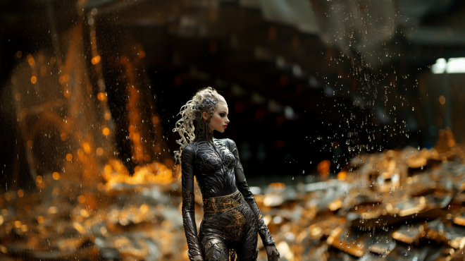 /imagine prompt: An award-winning photograph of a solitary alien creature - a Liquid Metal Data Element, envisioned as a female form. This beautifully sculpted feminine entity, formed by molten silver mercury-like alloys, carries vast information within its fluid form, the metallic symbols and glyphs swirling on her surface are a visual representation of the data she holds. Her solitary state mirrors the loneliness of such a unique and powerful being. Set against the stark backdrop of a cold, deserted server room, the glow from active circuits further highlights her solitude. The image captures her under harsh white fluorescent lighting, causing the fluid metal woman to shimmer with an unnatural cold blue hue, while reflections and glimmers add depth. This masterful composition emphasizes the creature's solitude amidst the cold high-tech environment, creating a visually stunning, thought-provoking statement. Insanely high resolution, realistic, 8k, HD, HDR, XDR, focus + sharpen + wide-angle 8K resolution + photorealistic + HDR10 Ken Burns effect + Adobe Lightroom + rule-of-thirds + octane render --ar 16:9 --s 1000 --c 70