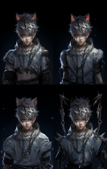 a boy with blue eyes and Animal ears, Wearing a spiked collar around the neck, a strong body with chains around it,in the style of dreamlike fantasy creatures, unreal engine 5, light gray and silver, [xu beihong](https://goo.gl/search?artist%20xu%20beihong), detailed facial features, close-up intensity, bold and energetic --ar 7:11