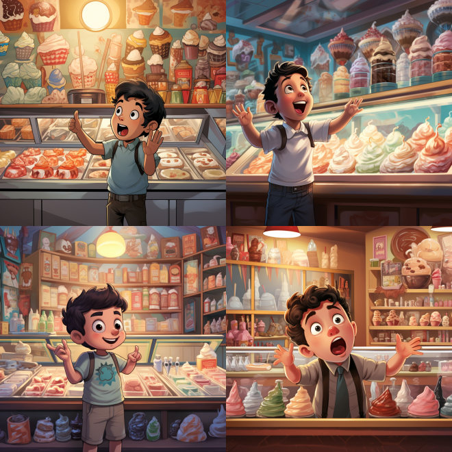In a super-cartoonish style, a little boy stands in front of the counter, his eyes wide open, pointing enthusiastically at the ice cream choices on the counter.