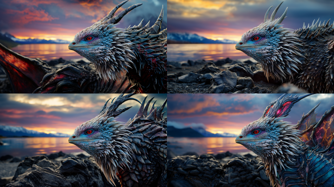 /imagine prompt: An award-winning photograph of a majestic dragon with shimmering scales of iridescent blues and purples in a foreboding volcanic landscape, caught in the midst of an epic battle with knights clad in shining armor under the harsh light of a blood-red sunset. The dramatic lighting casts long, dark shadows across the scene, emphasizing the dragon's massive size compared to the tiny, courageous humans challenging it, their metallic armors glinting ominously. The image perfectly captures the tension and chaos of the fantastical scenario, making the viewer almost hear the clash of steel against the dragon's tough scales. Advanced composition techniques like depth of field and rule of thirds have been employed to guide the viewer's eye to the relentless confrontation at the center of the frame. The photographic quality is enhanced by digital post-processing tools creating a visually stunning spectacle in insanely high resolution, realistic, 8k, HD, HDR, XDR, focus + sharpen + wide-angle 8K resolution + photorealistic + HDR10 Ken Burns effect + Adobe Lightroom + rule-of-thirds + octane render --ar 16:9 --s 1000 --c 70