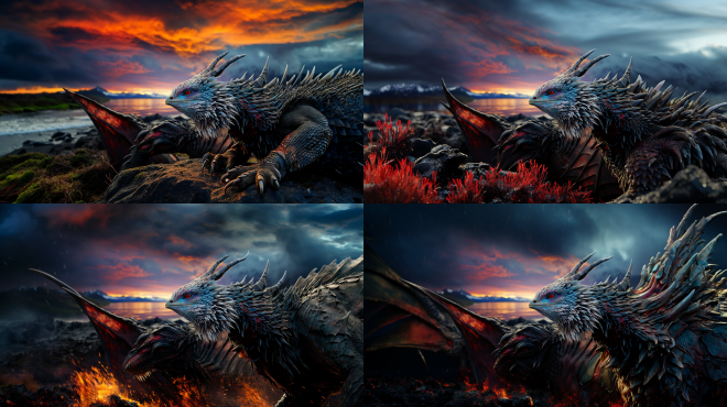 /imagine prompt: An award-winning photograph of a majestic dragon with shimmering scales of iridescent blues and purples in a foreboding volcanic landscape, caught in the midst of an epic battle with knights clad in shining armor under the harsh light of a blood-red sunset. The dramatic lighting casts long, dark shadows across the scene, emphasizing the dragon's massive size compared to the tiny, courageous humans challenging it, their metallic armors glinting ominously. The image perfectly captures the tension and chaos of the fantastical scenario, making the viewer almost hear the clash of steel against the dragon's tough scales. Advanced composition techniques like depth of field and rule of thirds have been employed to guide the viewer's eye to the relentless confrontation at the center of the frame. The photographic quality is enhanced by digital post-processing tools creating a visually stunning spectacle in insanely high resolution, realistic, 8k, HD, HDR, XDR, focus + sharpen + wide-angle 8K resolution + photorealistic + HDR10 Ken Burns effect + Adobe Lightroom + rule-of-thirds + octane render --ar 16:9 --s 1000 --c 70