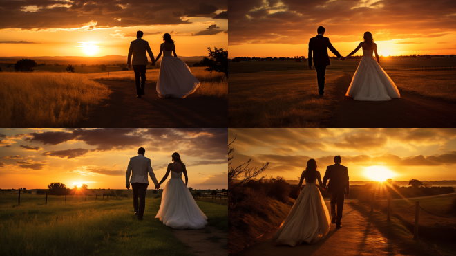 /imagine wedding photography bride and groom walking hand in hand into the sunset -- 5.1 --ar 16:9