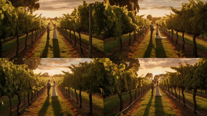 /imagine wedding photography, bride and groom facing each other in vineyard --v 5.1 --ar 16:9