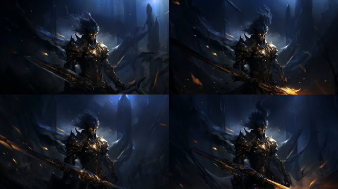 a knight in armour with an arrow in his hand, in the style of dark azure and gold, fluid dynamic brushwork, 32k uhd, [li shuxing](https://goo.gl/search?artist%20li%20shuxing), crystalcore, [loish](https://goo.gl/search?artist%20loish), [even mehl amundsen](https://goo.gl/search?artist%20even%20mehl%20amundsen) --ar 16:9
