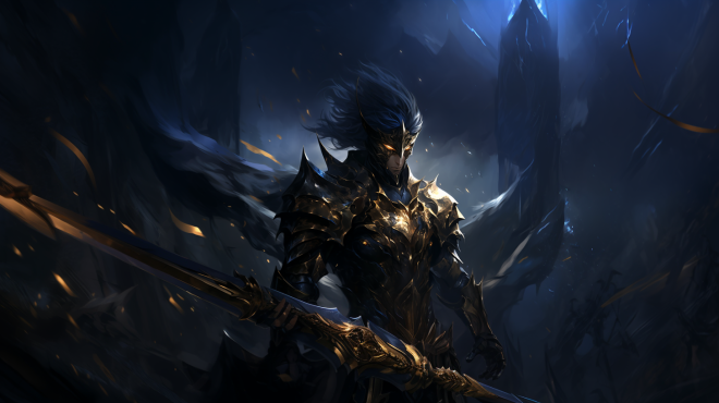a knight in armour with an arrow in his hand, in the style of dark azure and gold, fluid dynamic brushwork, 32k uhd, [li shuxing](https://goo.gl/search?artist%20li%20shuxing), crystalcore, [loish](https://goo.gl/search?artist%20loish), [even mehl amundsen](https://goo.gl/search?artist%20even%20mehl%20amundsen) --ar 16:9