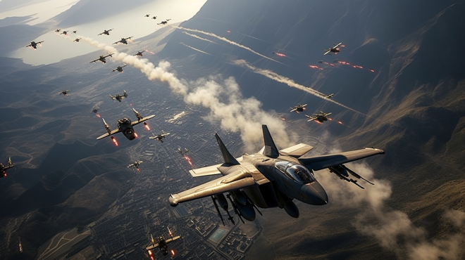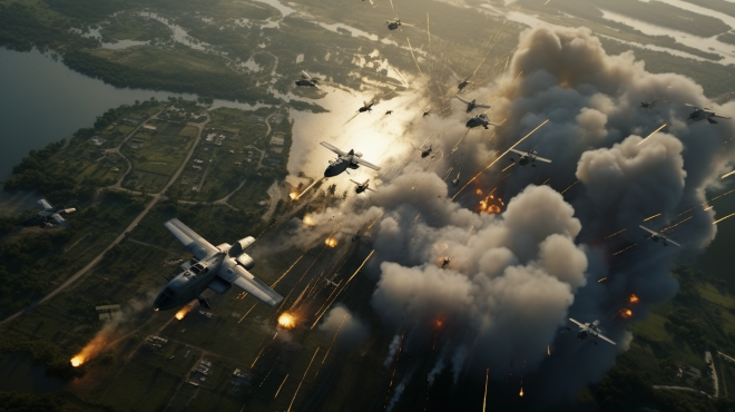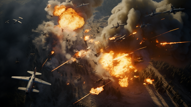 This is a still from a 2030 movie titled 'Midway', directed by Roland Emmerich, showing aircraft engaged in aerial combat during midday, with a fast-paced tense atmosphere. A DJI Inspire 2 drone equipped with a Zenmuse X7 camera was used to capture the air battle and panoramic shots. The image has an ISO of 1600, an aperture of f/4, and underwent post-processing. --ar 16:9 --style raw --v 5.2