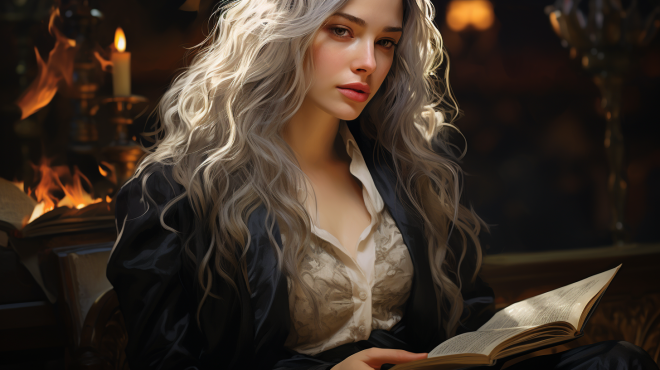 Venara, reading a book in the study, in a detective style, with flowing silver hair --s 400 --ar 16:9