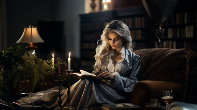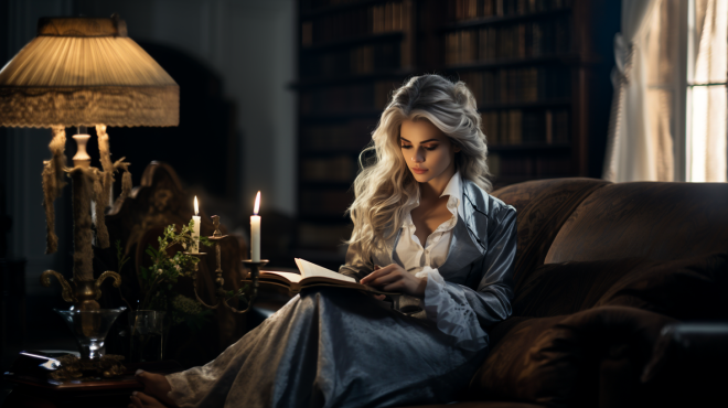 Venara, reading a book in the study, in a detective style, with flowing silver hair,unsplash --s 400 --ar 16:9