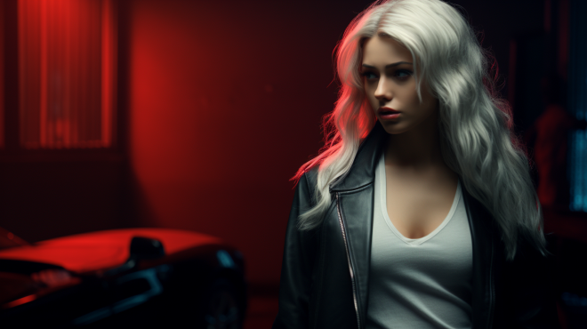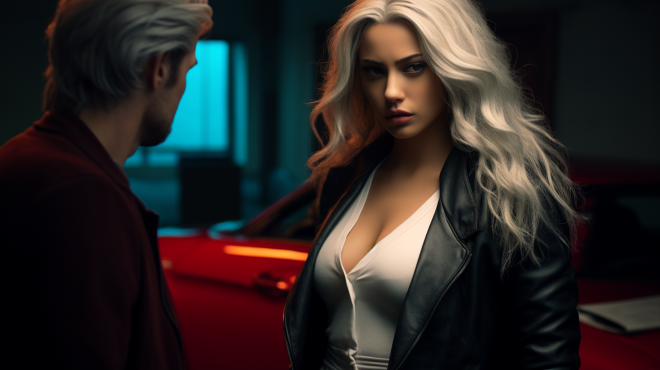 Camera Shot: Medium shot capturing Venara, the detective with flowing silver hair, engaged in a fierce confrontation with a mysterious and deadly suspect in a room.