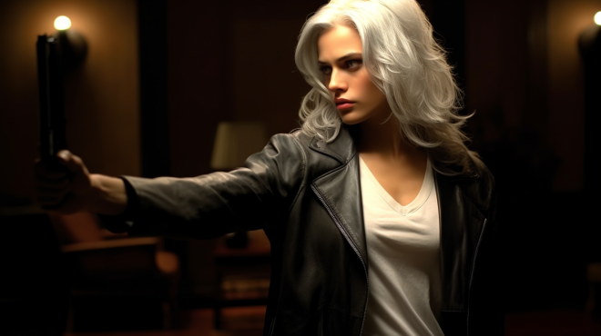 Camera Shot: Medium shot capturing Venara, the detective with flowing silver hair, in a room facing off with a suspect holding a firearm::3;Both characters point guns at each other::8;