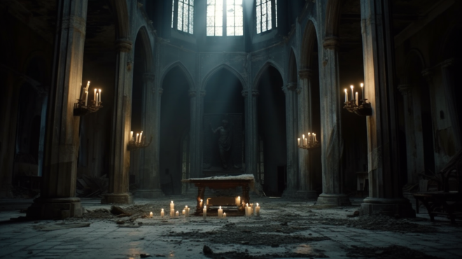 A movie scene; Era: 15th century; Movie genre and style: Medieval thriller; Movie title: 'Realm of Shadows'; Directed by David Fincher; Camera perspective: Low Angle Shot; Filming equipment: Canon C300 Mark III; Plot: Inside an abandoned church, flickering candlelight creates a sinister atmosphere. Something seems to be lurking in the darkness. Elements: Low angle shot, dim candlelight illuminating the interior of the church, evoking a sense of mystery; Camera settings: 4K resolution, black and white color grading, appropriate shutter speed and aperture; Lighting effect: Candlelight casting an eerie ambiance, blurring the surrounding contours; Movie still: Candlelight reflecting in the somber environment of the church; film grain,unsplash --s 400 --style raw --ar 16:9 --v 5.1
